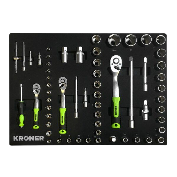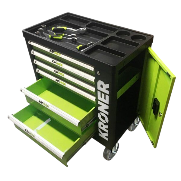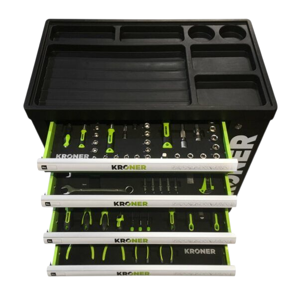 Las herramientas vienen en un carro ultra resistente metálico de 6 compartimientos con ruedas. Las piezas se almacenan de forma segura y ordenada, para protegerlas ante suciedad y daños, organizarlas y encontrarlas fácilmente.