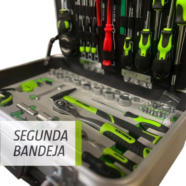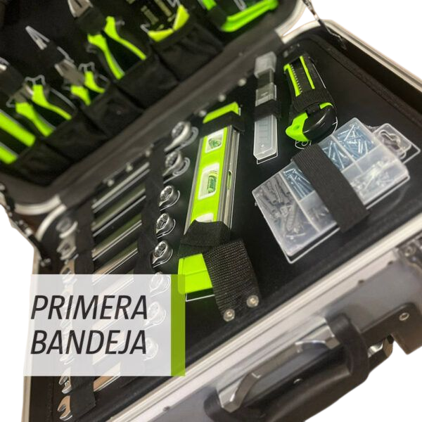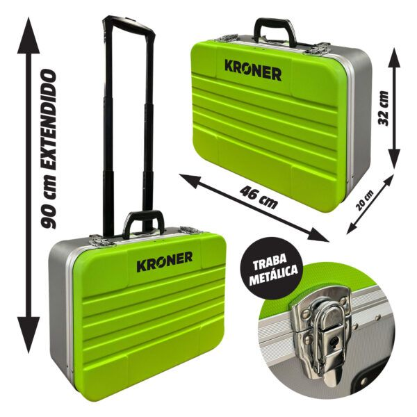 Maletín profesional de transporte con manija y ruedas estilo valija.