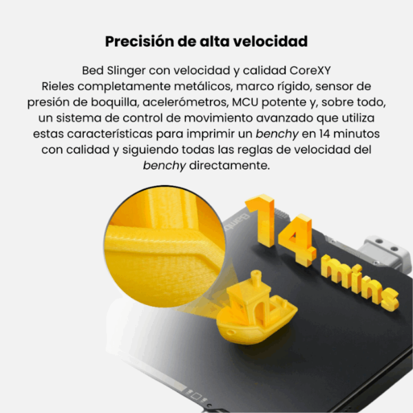 Impresión con Desplazamiento de la Cama a Alta Velocidad y Calidad (Alta Precisión): Raíles completamente metálicos, marco deslizante, sensor de presión de la boquilla, acelerómetros, potente MCU y, sobre todo, un sistema avanzado de control de movimiento que utiliza estas características para imprimir un barco de prueba (benchy) en solo 14 minutos con calidad perfecta directamente desde la caja, utilizando cualquier bobina de PLA al azar.