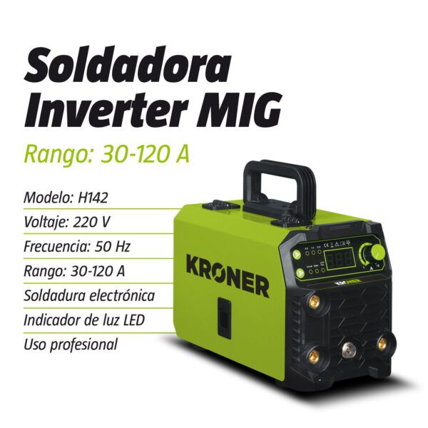 Para alambre FLUX y Electrodo 2 en 1, adecuada para usuarios hobby y semi profesionales en procesos MIG, MAG, con potencia hasta 120 amp. Equipo de calidad para soldadura y de uso sencillo. Incorpora un alimentador interno para una unidad compacta y versátil. Sistema de rodillos de alimentación compatible con bobinas de alambres de Ø0,6 a 1 mm. Panel de comando para ajuste de parámetros del proceso MIG/MAG con perilla y botones de tamaño considerable para manejo con guantes de soldadura. Apta para agregarle correa para colgar.
